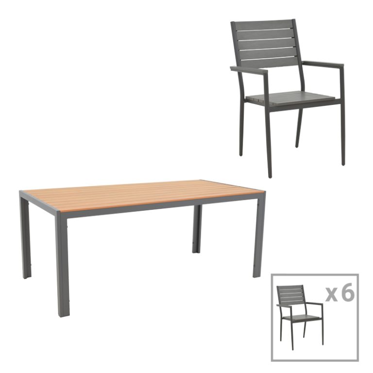 Tavolina e ngrënies Savor-Nares komplet prej 7 alumini antracit dhe kompensatë-rattan në ngjyrë natyrale 180x90x72.5cm