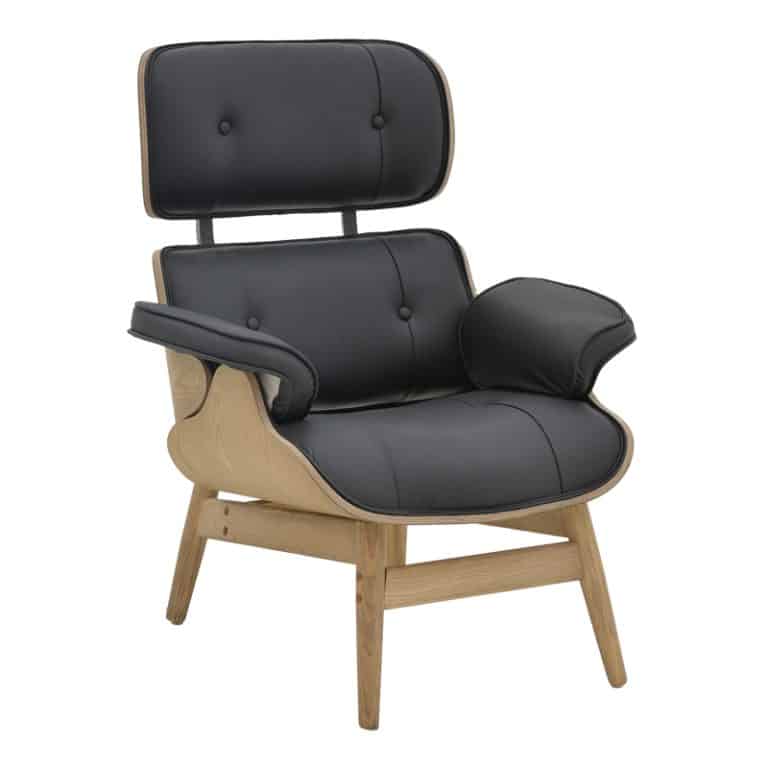 Karrige relaksuese Mirto, e bërë nga druri i ngurtë me ngjyrë arra dhe PU në ngjyrë të zezë, me dimenzion 80x80x96.5 cm.