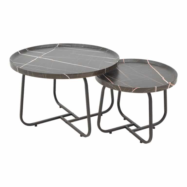 Set 2-pjesësh, tavolinë e mesme Crismory me 2 MDF në nuancë mermeri të zi dhe këmbë metalike të zeza