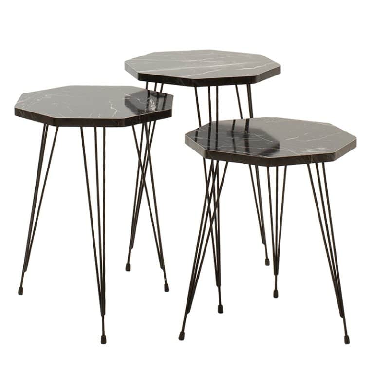 Tavolina anësore Wakmi 3 copë mermer i zi melamine metalike të zezë