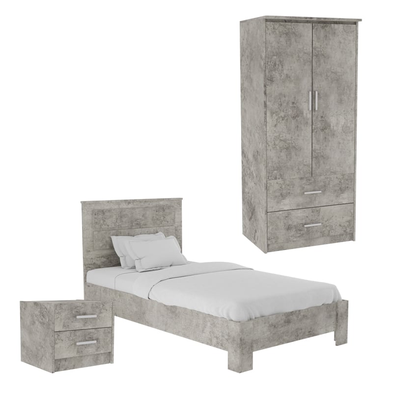 Kompleti përfshin një gardërobë, një komodinë dhe një krevat.