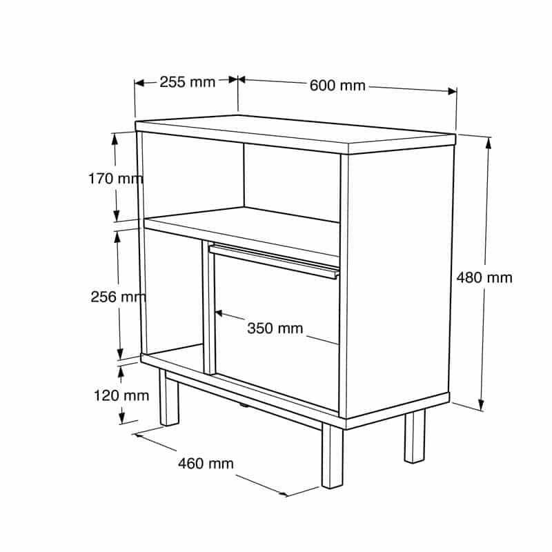 * Përmban dy rafte për mbështetjen e objekteve dekorative ose krijimin e komponimeve dekorative, si dhe një zonë të mbyllur magazinimi për më shumë ruajtje.