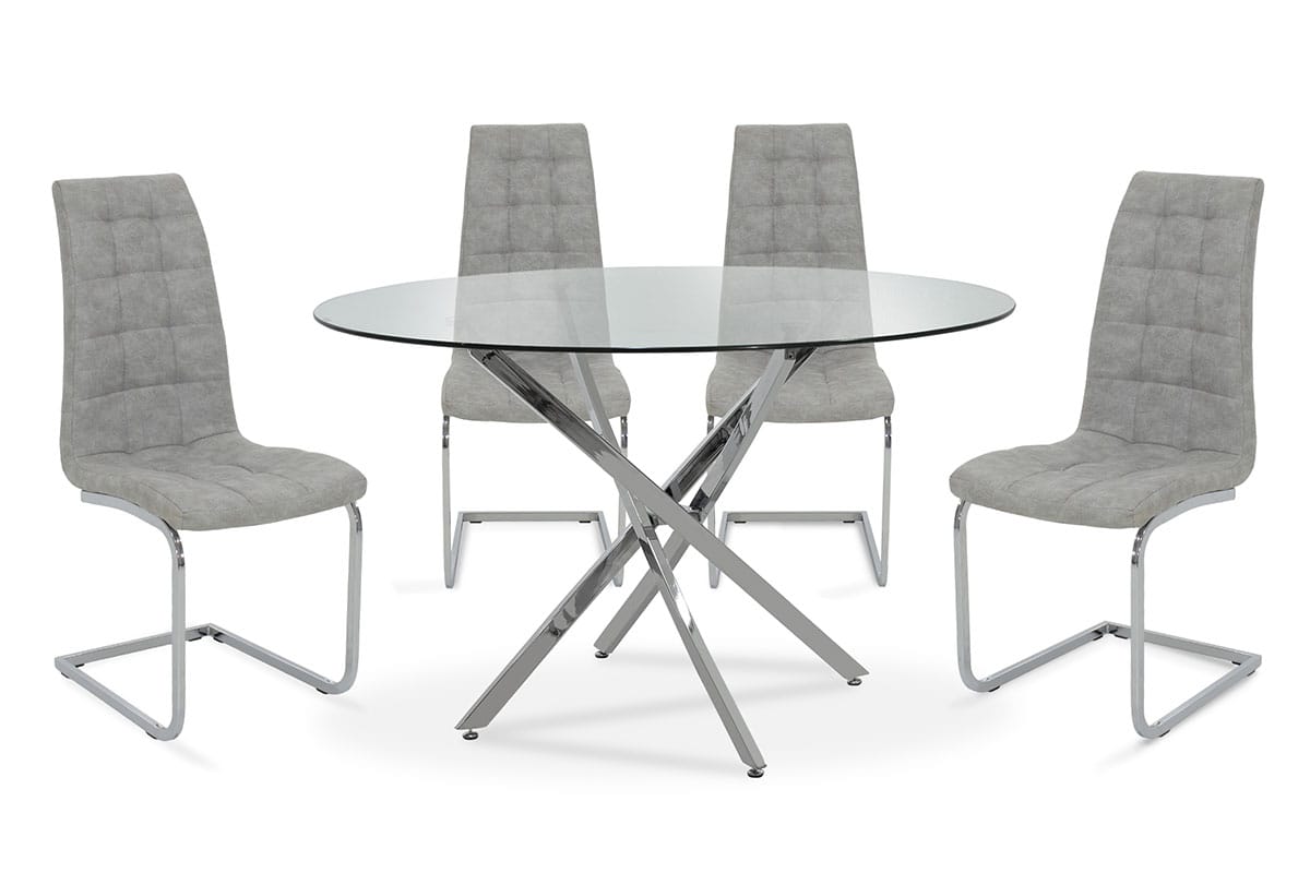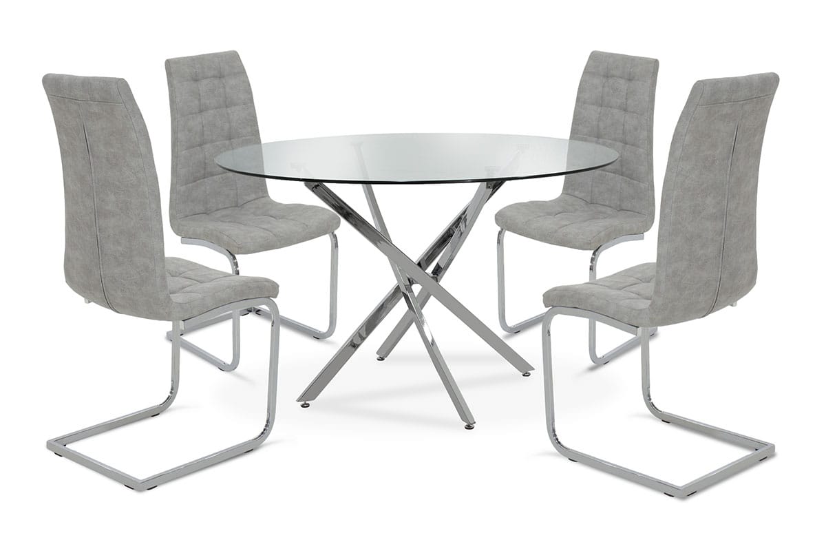 Tavolina e ngrënies e vendosur 5pcs Steve me qelq-karrige gri antike pu D120x74,5cm