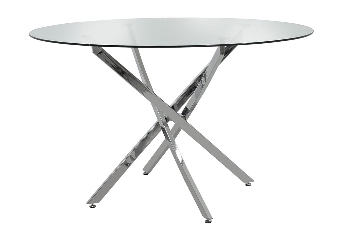 Kjo tryezë e rrumbullakët moderne ngrënieje ka një majë xhami të pastër me një theks qelqi të ngrirë dhe këmbë kromi
