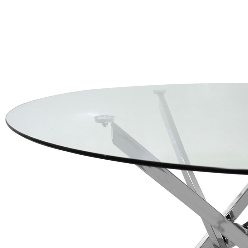 Kjo tryezë e rrumbullakët moderne ngrënieje ka një majë xhami të pastër me një theks qelqi të ngrirë dhe këmbë kromi